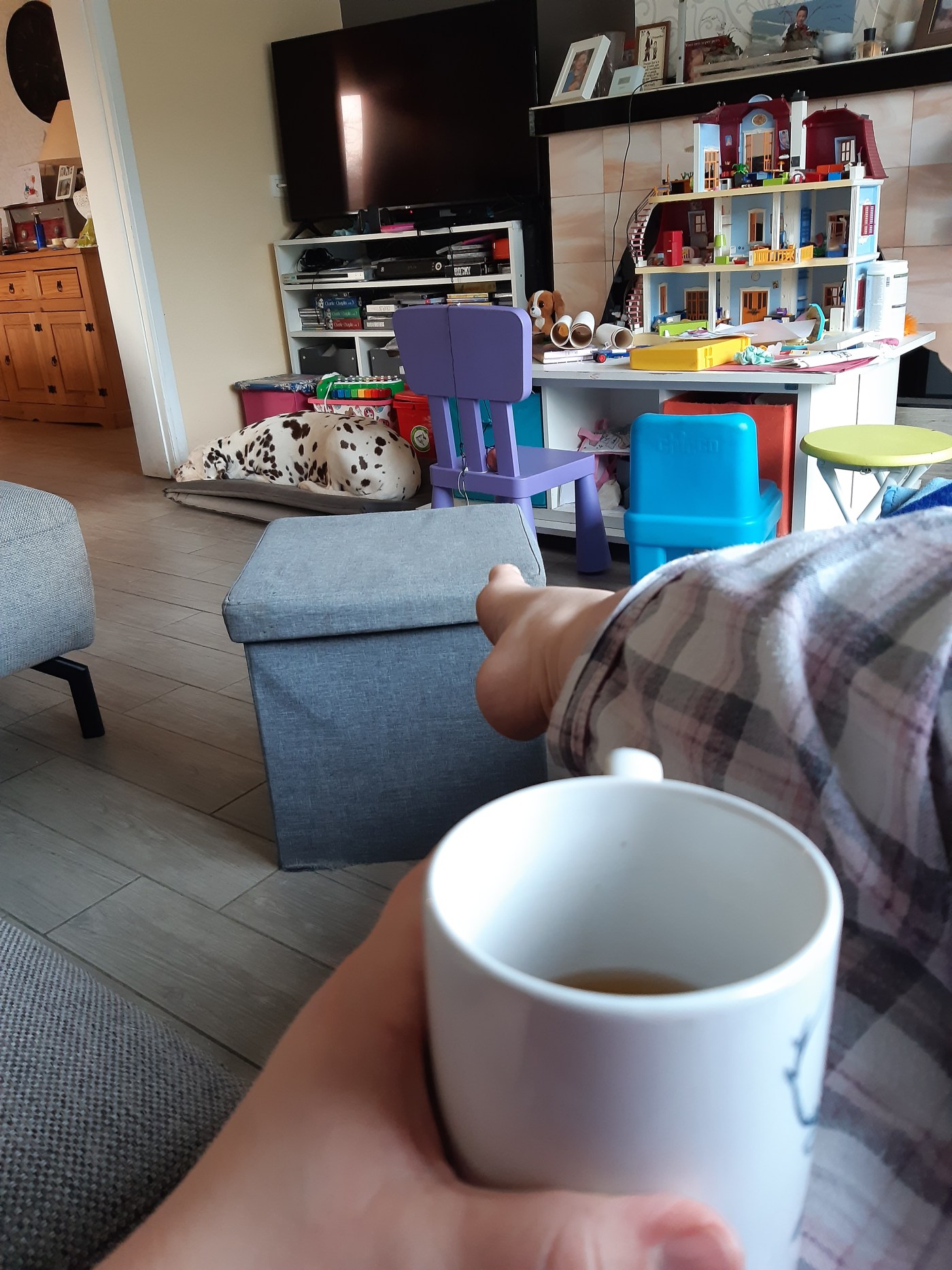 het materiaal halen van zijn werk kot achter het huis naar de gang is nogal lawaaierig. De plinten moeten op maat gezaagd worden, dat doet hij ook achter het huis, met de deur open. Hij komt binnen met de plinten door de woonkamer, om dan zo naar de gang te gaan, ook deur open. Ik bibber al van koorts, de trek van buiten kan ik missen als kiespijn. Opdracht voor Darya, de deur achter papa zijn achterwerk dicht doen. de eerste keren doet ze dat zonder morren, maar na de 3de keer is er al een zucht bij, en na de 10de keer wordt de zucht alsmaar luider, maar toch doet ze de deur telkens voor mij weer dicht.
